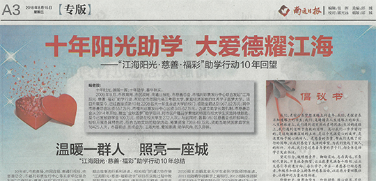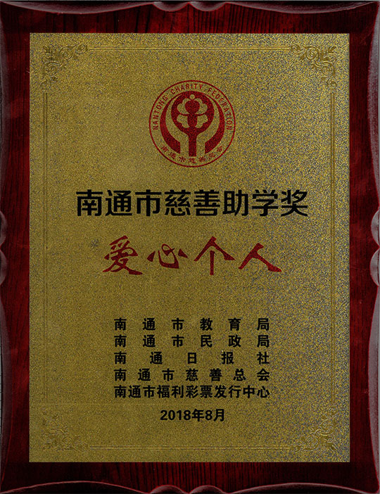 2018年8月15日,南通市教育局、南通市民政局、南通日報社、南通市慈善總會、南通市福利彩票發(fā)行中心公布了“南通市慈善助學獎”評選結果,南通三圣石墨設備科技股份有限公司董事長馮圣君、鄭輝夫婦榮獲“南通市慈善助學獎愛心個人”光榮稱號,全市僅有11人獲此殊榮。