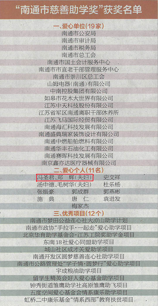 南通三圣董事長馮圣君夫婦榮獲“南通市慈善助學獎”愛心個人