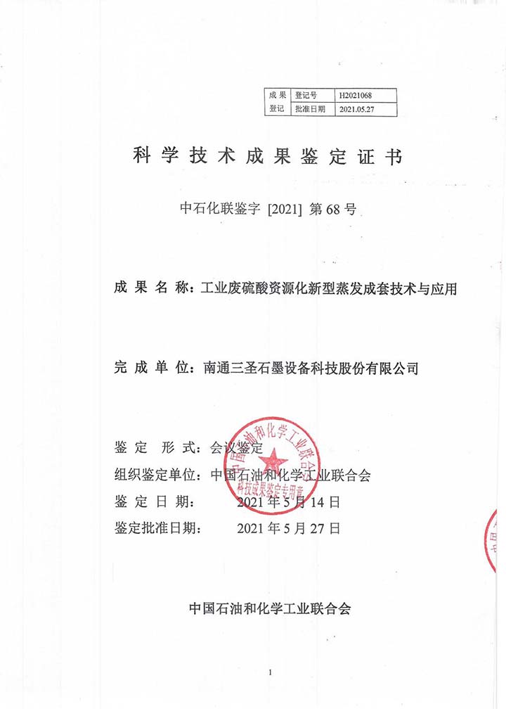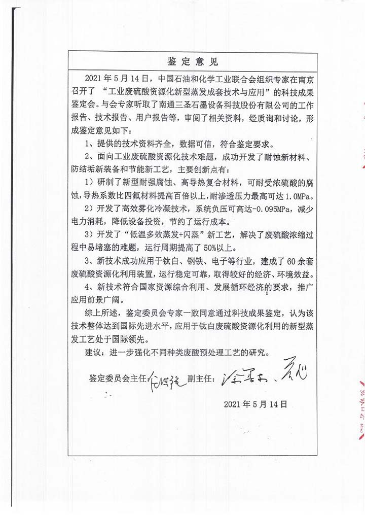 2021年5月27日,中國石油和化學工業(yè)聯(lián)合會批準了南通三圣石墨設備科技股份有限公司“工業(yè)廢硫酸資源化新型蒸發(fā)成套技術與應用”的科技成果鑒定,由南京大學任洪強院士擔任主任,華東理工大學涂善東院士、南京工業(yè)大學喬旭校長擔任副主任的鑒定委員會專家一致認為,該技術整體達到國際先進水平,應用于鈦白廢硫酸資源化利用的新型蒸發(fā)工藝處于國際領先。