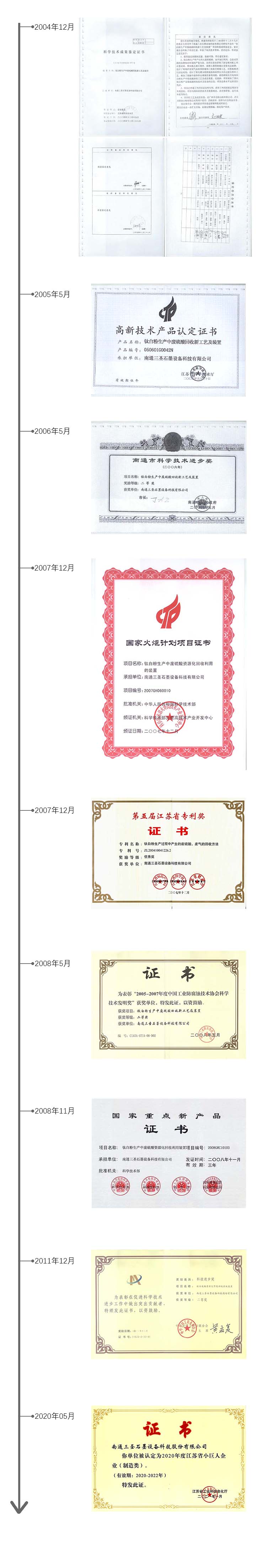 南通三圣該項技術先后得到了政府諸多部門的高度評價。2004年12月,“鈦白粉生產(chǎn)中廢硫酸回收新工藝及裝置”通過江蘇省科技廳組織的科技成果鑒定,鑒定意見指出,該項成果填補了國內(nèi)鈦白粉產(chǎn)業(yè)廢硫酸回收技術及裝備的空白,總體水平達到國際先進。2005年5月,該項成果被認定為江蘇省高新技術產(chǎn)品。2006年5月,該項成果榮獲南通市科技進步二等獎。2007年12月,“鈦白粉生產(chǎn)中廢硫酸資源化回收利用的裝置”被科技部列為國家火炬計劃項目。2007年12月,“鈦白粉生產(chǎn)過程中產(chǎn)生的廢硫酸、廢氣的回收方法”榮獲江蘇省優(yōu)秀專利獎。2008年5月,“鈦白粉生產(chǎn)中廢硫酸回收新工藝及裝置”榮獲中國工業(yè)防腐蝕技術協(xié)會技術發(fā)明二等獎。2008年11月,“鈦白粉生產(chǎn)中廢硫酸資源化回收利用裝置”被科技部、環(huán)保部、商務部、國家質(zhì)檢總局認定為國家重點新產(chǎn)品。2011年12月,“鈦白廢酸資源化節(jié)能回收系統(tǒng)裝置”榮獲中華全國工商業(yè)聯(lián)合會科技進步二等獎。2020年,公司以工業(yè)廢副硫酸低能耗蒸發(fā)濃縮與資源化回收成套裝備產(chǎn)品獲得江蘇省專精特新小巨人企業(yè)榮譽稱號。