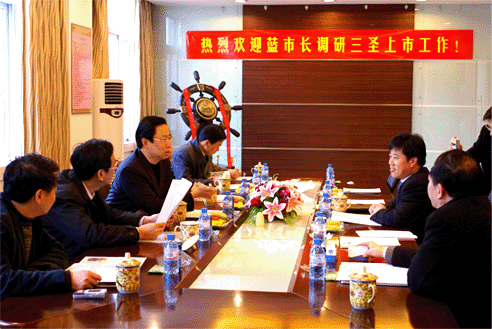 日前,南通市常務(wù)副市長藍(lán)紹敏率領(lǐng)市發(fā)改、經(jīng)貿(mào)等部門主要領(lǐng)導(dǎo),到三圣公司調(diào)研上市工作,公司董事長馮圣君及部分高管陪同調(diào)研。