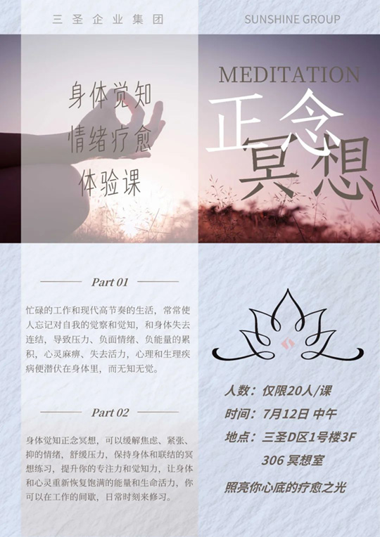 三圣集團(tuán)最新開設(shè)的冥想課程,旨在幫助職工通過冥想達(dá)到內(nèi)心的寧?kù)o與平和,提升個(gè)人的情緒管理、專注力和生活質(zhì)量。隨著今天第一堂體驗(yàn)課的啟動(dòng),之后每周都有免費(fèi)的公益課程可報(bào)名參加。這一全新形式的開放課程,升華了三圣企業(yè)文化的精神內(nèi)涵。