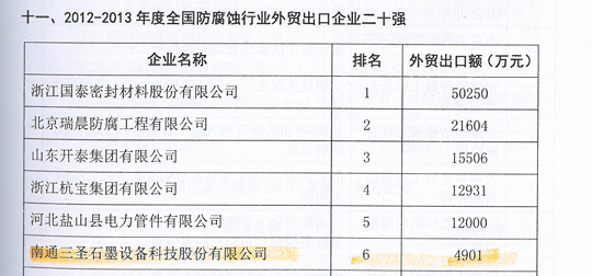 在剛剛閉幕的第五屆中國國際腐蝕控制大會上,南通三圣石墨設(shè)備科技股份有限公司憑借其優(yōu)異的業(yè)績榮登三大榜單,分別是:"2012-2013年度全國防腐蝕行業(yè)二十強(qiáng)企業(yè)"(排名第7位);"2012-2013年度全國非金屬壓力容器企業(yè)二十強(qiáng)"(排名第1位);"2012-2013年度全國防腐蝕行業(yè)外貿(mào)出口企業(yè)二十強(qiáng)"(排名第6位)。